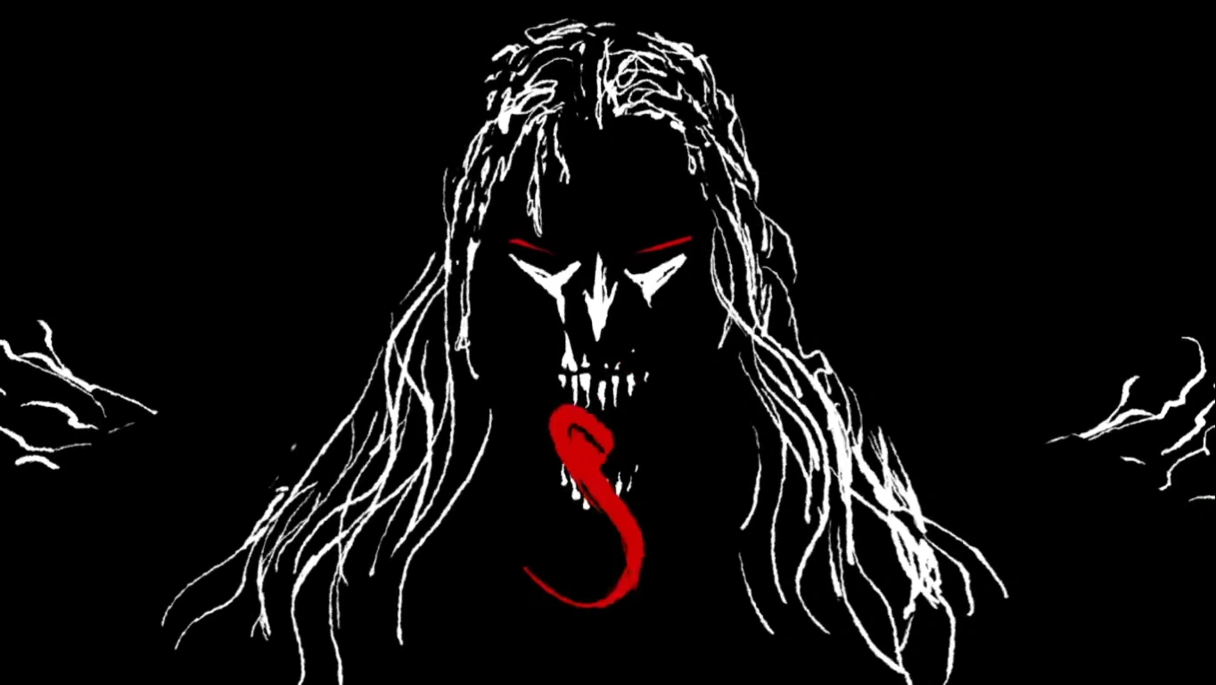 Knull is a giant cosmic being with blood-red eyes, shriveled hair, jagged teeth, and a tongue similar to his Klyntar creations.